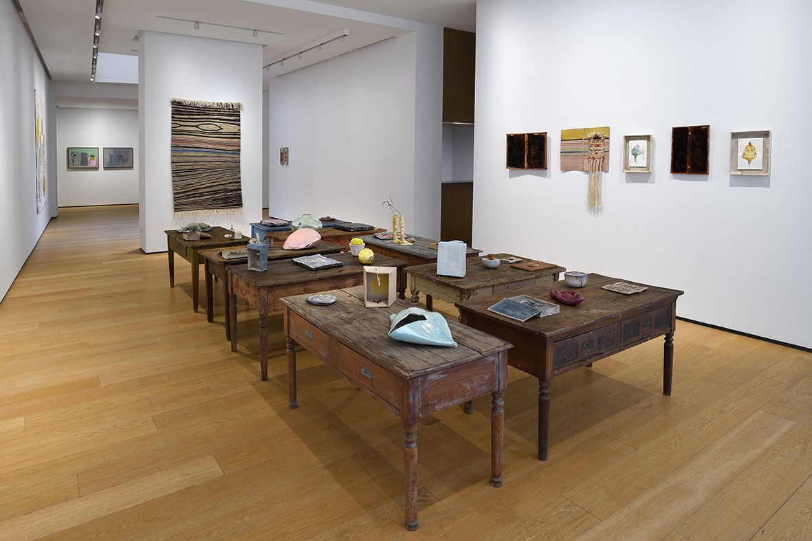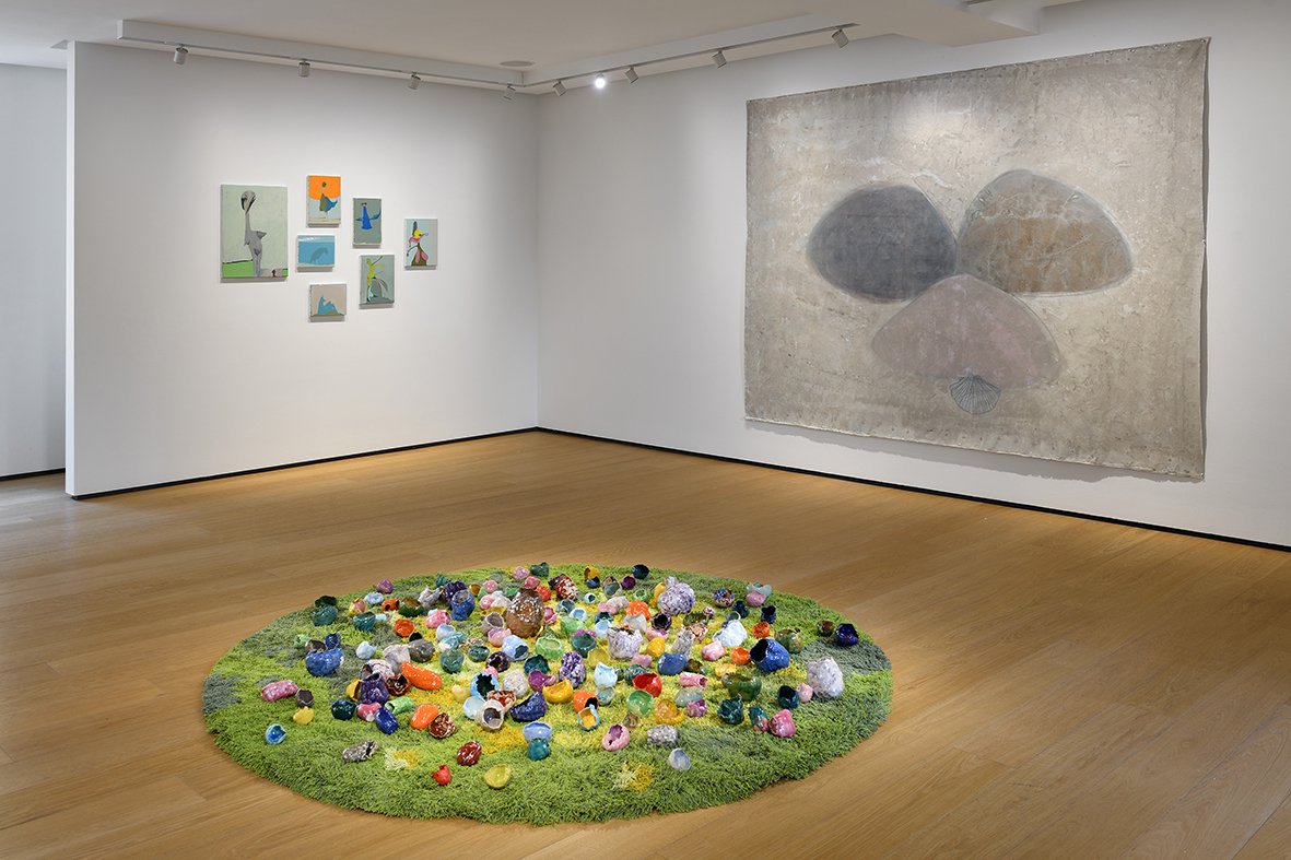 In the center of the room, on the floor, The Hand of Nature (2024)—a circular green carpet on which countless small colored ceramic sculptures lie—dialogues with several works presented on the wall. On one side, the free canvas The Translucent Skin of the Present (2015-2016) is a genuine homage to the time when pictorial representation serves as the basis for 360 progressive layers of limestone created over an entire year. On the other, a series of glazed ceramic sculptures entitled Earth Island (2019-2022). The exhibition ends with Terra Madre (2024), an installation produced for the 6th Mardin Biennial (2024) in Turkey, consisting of two flags made of embroidered jute bags and a large geographical map made of felt.