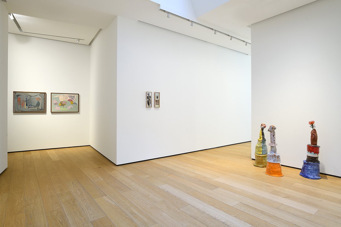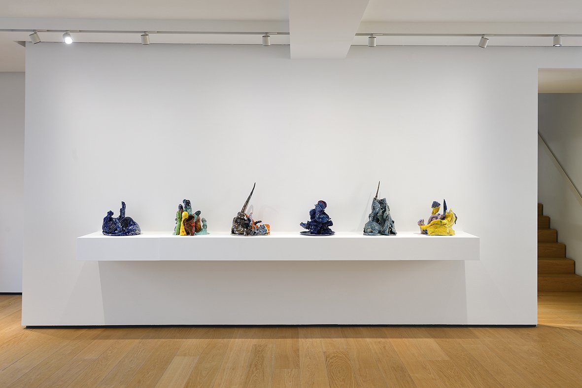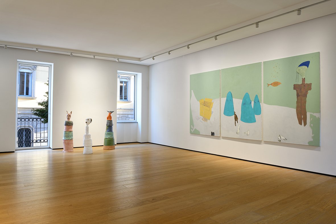 Janas Code is thus the doorway to a series of paintings and sculptures, created between 2015 and 2021, which populate the exhibition space on the ground floor of the gallery, such as the paintings: Enchanted, Nature, Revisited (2015), Le Spectateur Émancipé (2015), Sandwiched Life (2021), The Cave of Words (2021), and Vanity Fair (2021), as well as the glazed ceramics: The Fire Worshipper (2023-2024), L’Homme Guépard n. 2 (2024), and The Man with a Flower in His Mouth (2024-2025).