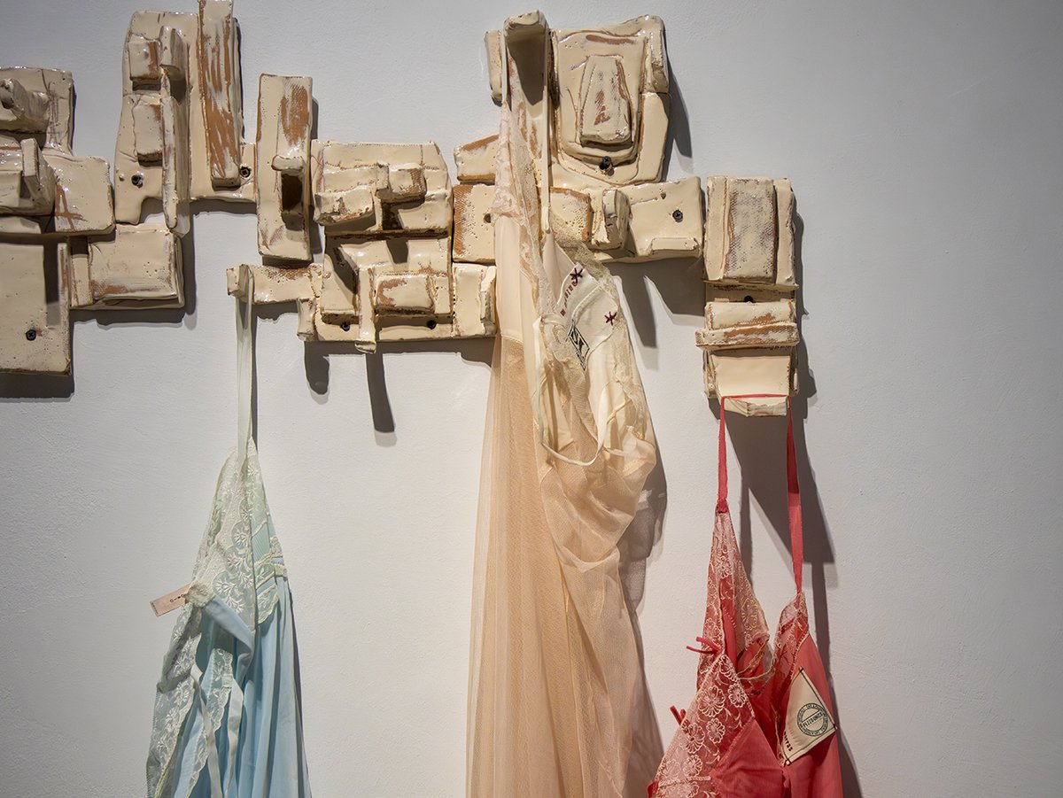 For the occasion, BUILDING BOX presents a display designed specifically for the space, drawing inspiration from the atmosphere of the place. The display windows become, in fact, a small temple within which Marras places a series of vertical elements evoking caryatids. In this instance, the figures are replaced by women’s garments hanging from glazed ceramics—somewhere between reliefs and sculptures—on which small holes appear. Clothes become Anime that cross the space, and it is as if they maintain a connection with the bodies that once wore them.