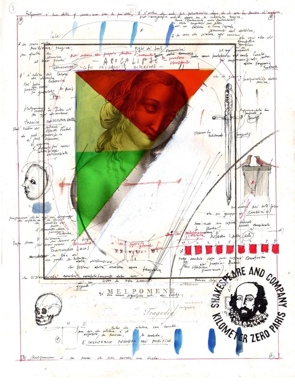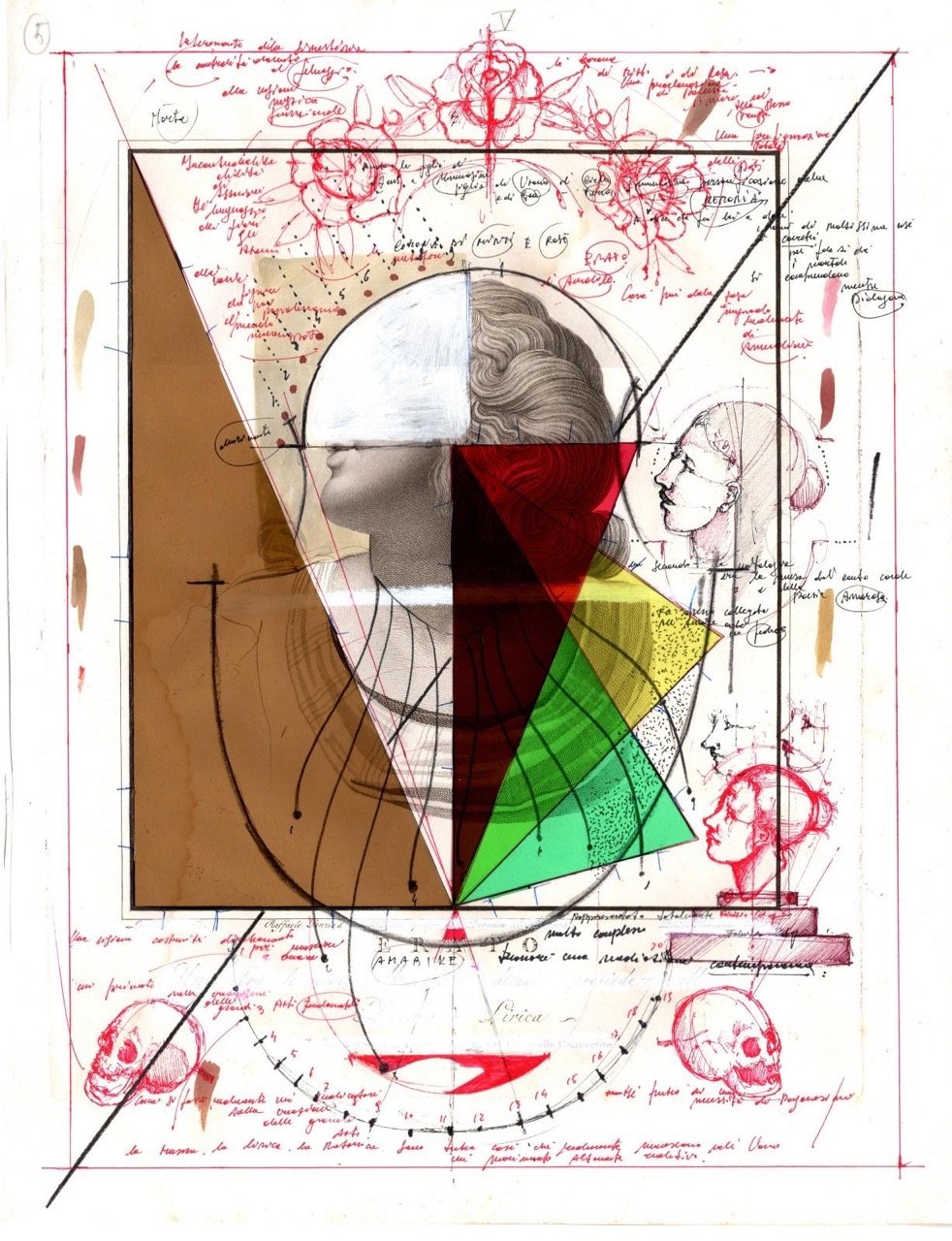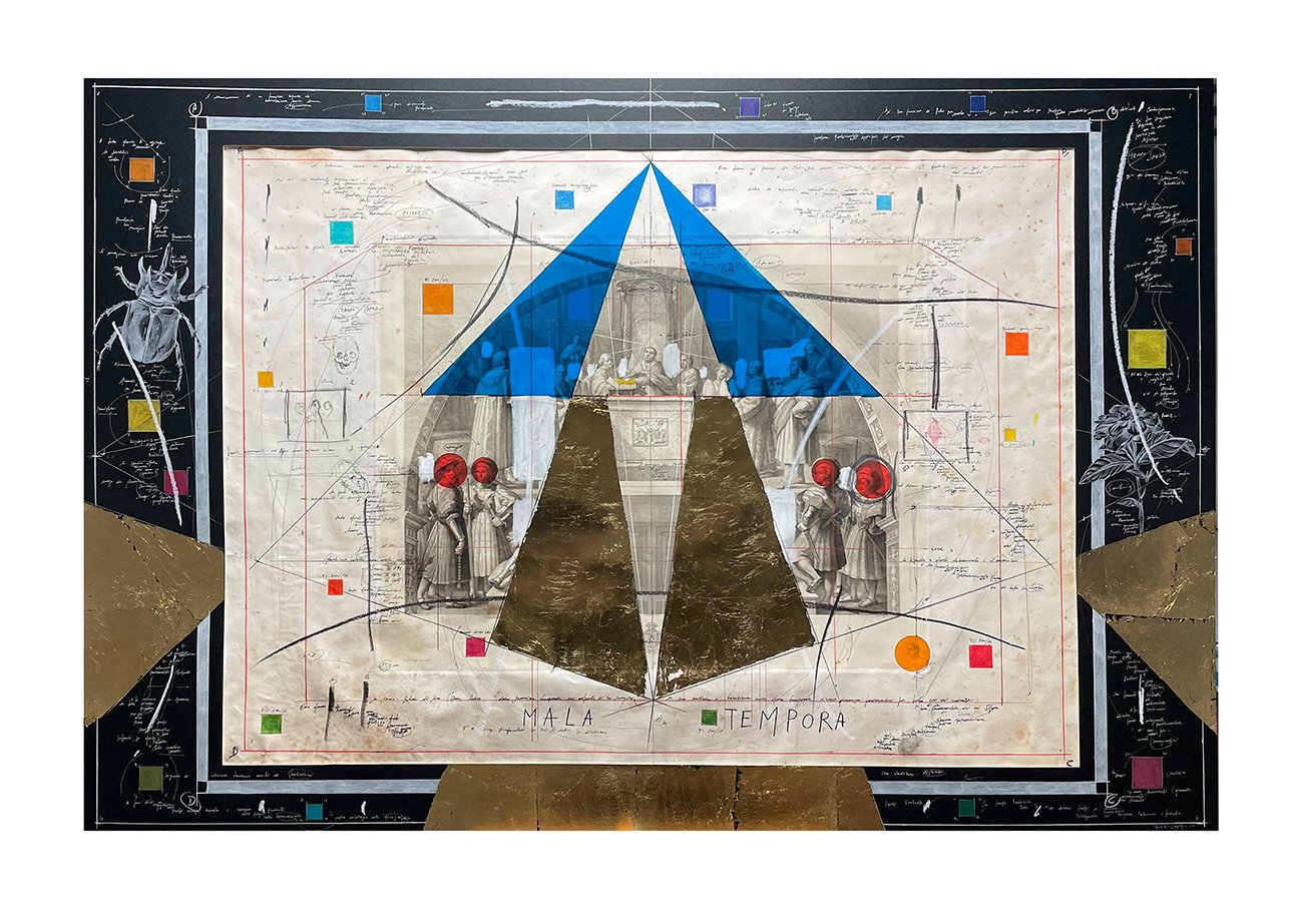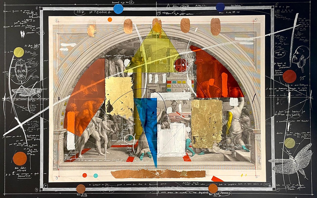 Fabrizio Cotognini is a composer, an artist-composer who develops a refined expressive language with musical accents, inscribed in a dual perspective. The approach adopted for his new solo exhibition, Divino Dialogare, focuses on the search for large and precious engravings linked to Raphael’s universal works, such as The School of Athens (1509-1511 ca.), The Fire in Borgo (1514), The Death of Ananias (1515-1516), The Coronation of Leo III (1517), and Self-Portrait with a Friend (1518-1520), translated by superb masters of the burin, Giovanni Volpato (Angarano, 1735 – Roma, 1803) and Raffaello Morghen (Portici, 1758 – Firenze, 1833), as well as on finding rare book editions from which he extracts poetic reproductions of the Muses of Parnassus. The valuable finds, recovered with constant passion, become palettes for Cotognini, elements on which he intervenes to make new chords resonate.