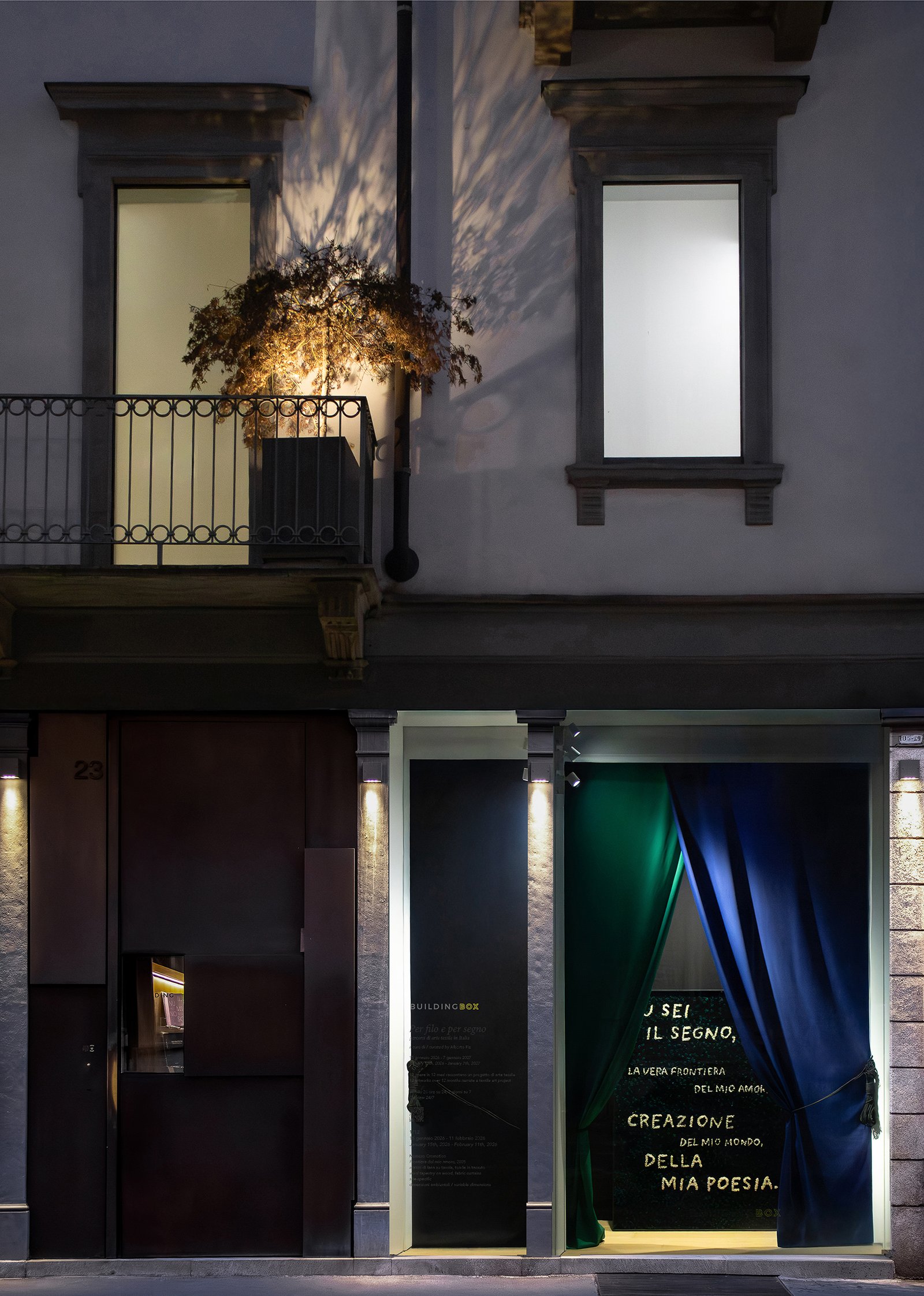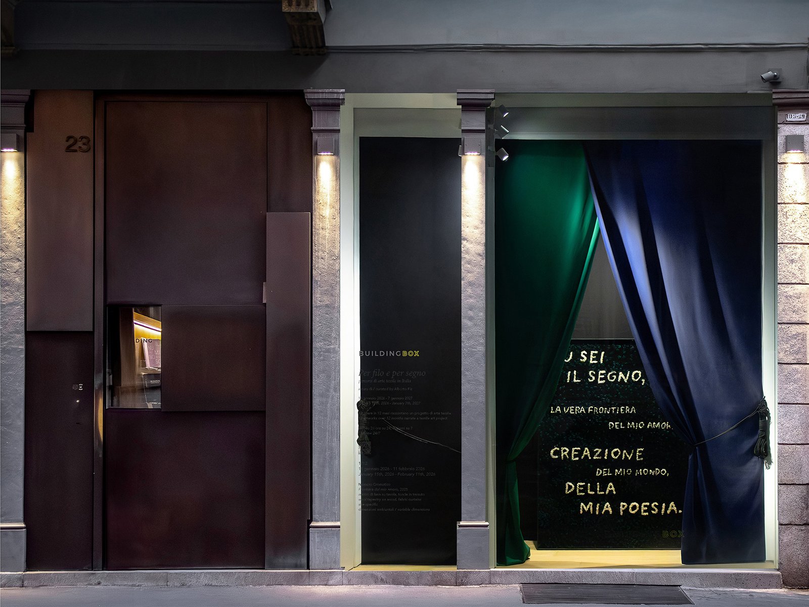 Dal 15 gennaio 2026 al 6 gennaio 2027, BUILDING BOX presenta Per filo e per segno. Percorsi di arte tessile in Italia, un progetto espositivo a cura di Alberto Fiz che coinvolge dodici artisti italiani di generazioni differenti, invitati a riflettere sul tema del tessile contemporaneo. Nel corso del 2026, la rassegna propone, in dodici appuntamenti individuali a cadenza mensile, una selezione di arazzi, abiti, installazioni, sculture e lavori site-specific. I primi tre artisti proposti da BUILDING BOX sono: Numero Cromatico (collettivo artistico nato a Roma, 2011), Paola Anziché (Milano, 1975) e Maurizio Donzelli (Brescia, 1958).