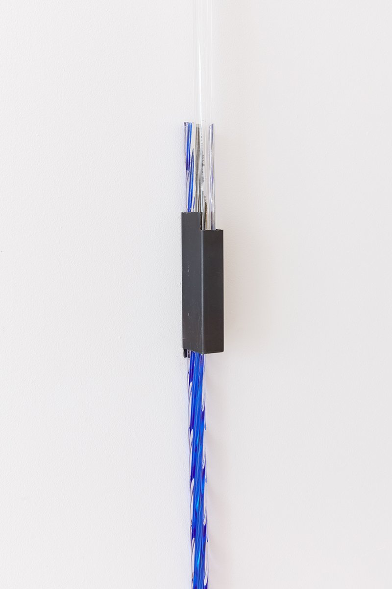 Il percorso espositivo si apre, al piano terra, con l’interazione di coppie di opere, facendo riferimento ad un “aperto” ricco di fenditure, prospettive e pendenze. Le prime sono due versioni di Ruffiani (2025) di Marco Andrea Magni, in cui dei listelli di legno sembrano sfuggire alla definizione di cornice; insieme a loro, due Untitled (2019) di Alice Cattaneo, in cui quattro differenti elementi in vetro di Murano sono congiunti da una presa di cemento e inseriti in una piccola forma di ferro che li sorregge verticalmente. Dall’opacità, queste coppie di opere portano chi guarda verso un primo incontro con l’apertura: Untitled segnano linee di demarcazione verticale nello spazio, come se il materiale fosse in grado di aprire uno spiraglio di luce tra due dimensioni differenti; Ruffiani, invece, amplificano le trasformazioni di un perimetro dato favorendo un nuovo tipo di visione oltre il confine dell’immagine stessa. In mostra la trasparenza e il suo opposto convivono continuamente, tanto nelle opere quanto nelle sale: da un primo spazio carico di matrice atmosferica si passa infatti ad un ambiente terso, in cui la tensione espositiva è mantenuta dai lavori allestiti. Questo movimento è guidato da Quasi mattina (2026) di Alice Cattaneo, una composizione di linee di piombo che abbracciano delle bacchette di vetro colorato, creando delle presenze evanescenti fatte d’ombra. Si incontrano quindi Cosmografia (fumo) (2024) e Cosmografia (ametista) (2024), una coppia di opere in cui Cattaneo ha sintetizzato forme di emanazione scultorea dal bidimensionale al tridimensionale grazie all’energia del fuoco di una fornace.