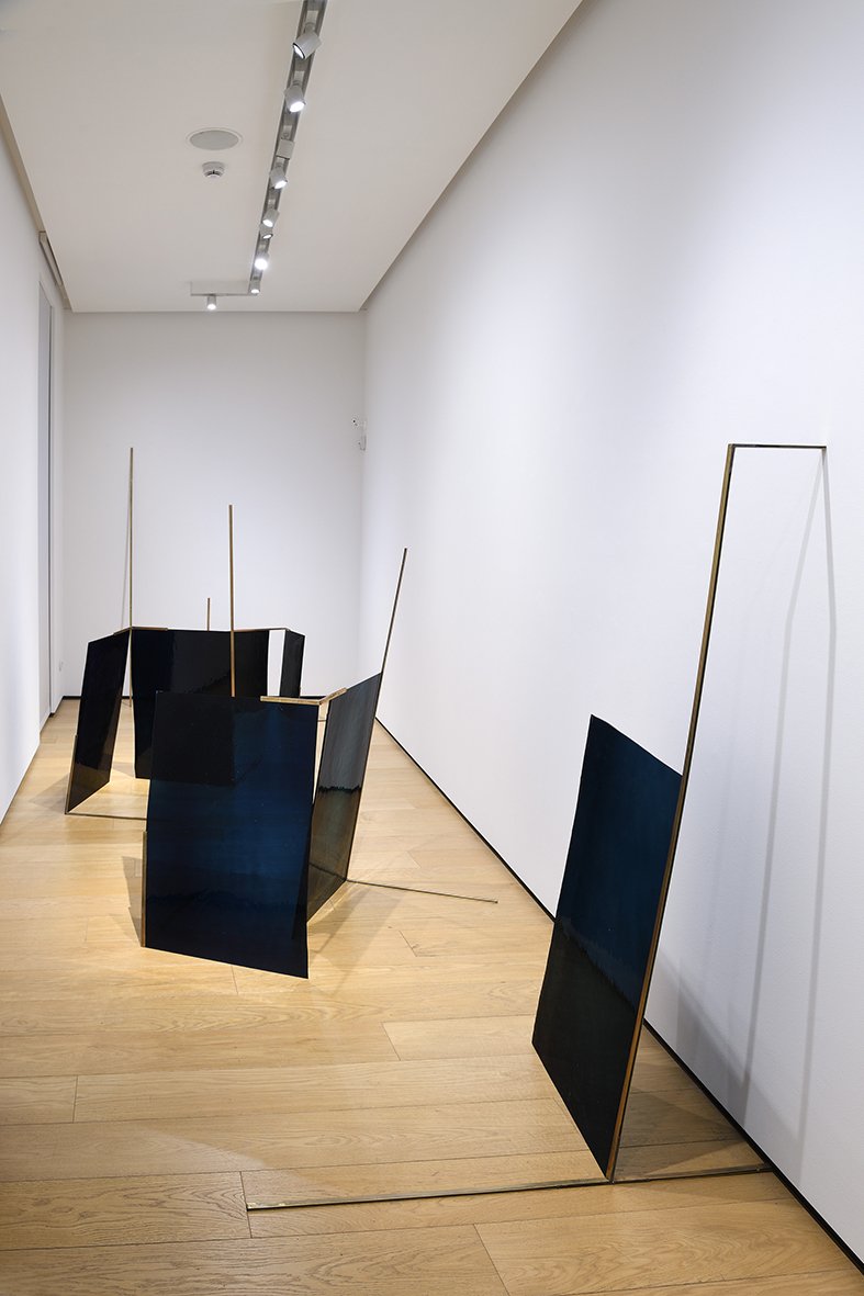 Nell’ultimo ambiente trova infine il proprio spazio Densità particolare (2026) di Alice Cattaneo, che conclude la mostra con un’immagine notturna, annebbiata, in grado di attirare un vuoto che si fa opera. Lastre di vetro soffiato scuro sono assemblate grazie ad elementi di ottone con un’anima di piombo ormai familiare. A questo punto gli occhi di chi guarda sono carichi di una sensazione fisica di opacità, proprio come quando vengono aperti in piena notte. La vista sembra quasi adattarsi scorgendo i contorni delle cose e dello spazio circostante. L’equilibrio è sempre parziale, tutto è pieno e allo stesso tempo vuoto nonostante ci si trovi in un mondo sempre tutto all’aperto.